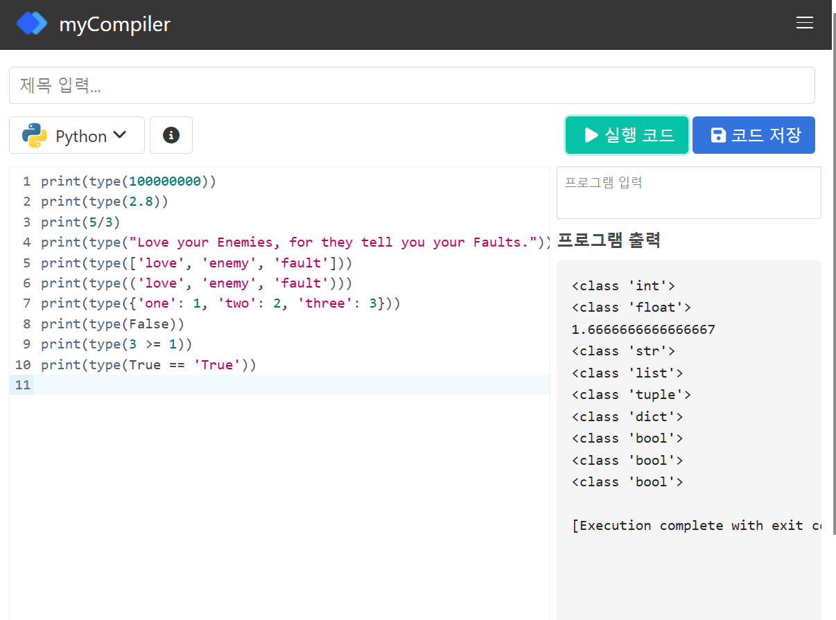 위 사이트에서는 별도의 파이썬프로그램 설치 없이도 파이썬 코드를 작성하고 실행시켜 볼 수 있습니다.