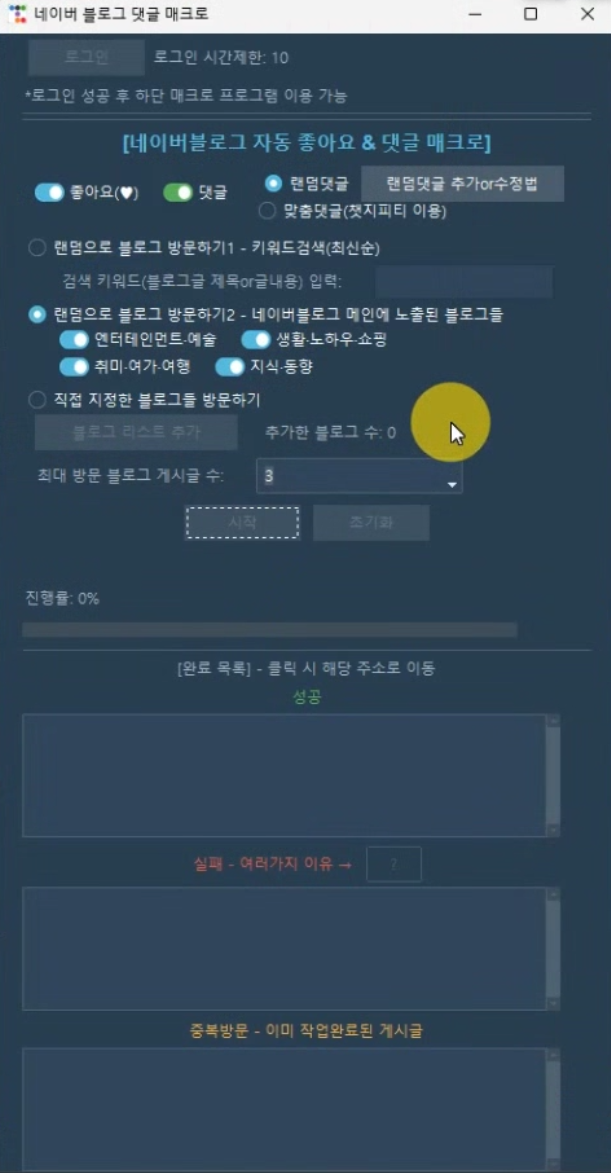 4) 방문하고싶은 블로그글 카테고리를 선택하고(4개중 최소 1개이상 선택해야함) <시작>버튼을 클릭하면 네이버 블로그 메인 페이지에 노출되있는 블로그들(주로 인기글들)중 선택된 카테고리에 들어있는 블로그들 랜덤으로 방문함.