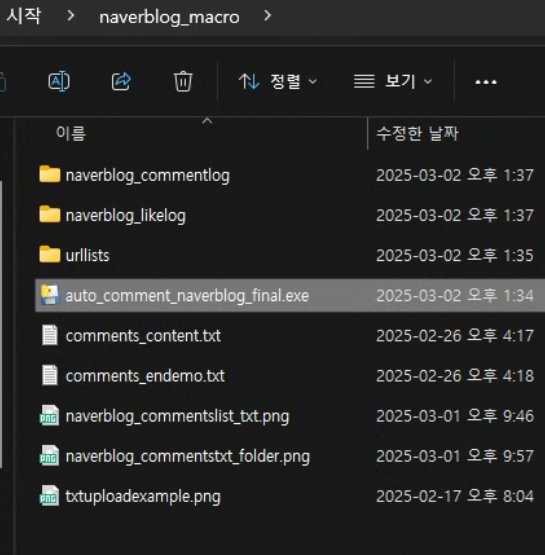 프로그램 구매 시엔 naverblog_macro라는 폴더를 드리며 해당 폴더 안에서 auto_comment_naverblog_final.exe파일을 실행시키면 프로그램이 구동됩니다.