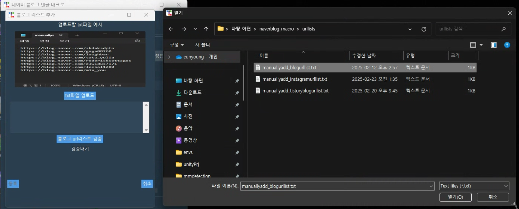 4) <블로그 리스트 추가>버튼을 눌러 방문하고싶은 블로그 링크들이 나열되있는 텍스트파일을 선택함