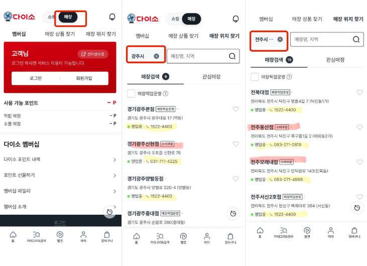 - 다이소몰 어플 메인 화면에서 상단 [매장] 클릭