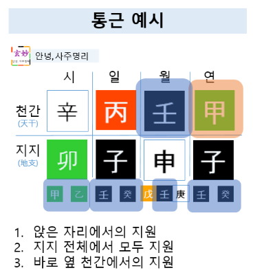 👉 T존(티존), 통근(通根), 투간(透干) 입니다.