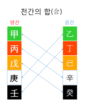 오행이 음양으로 나뉜 것이 바로 천간(甲, 乙, 丙, 丁, 戊, 己, 庚, 辛, 壬, 癸) 입니다.