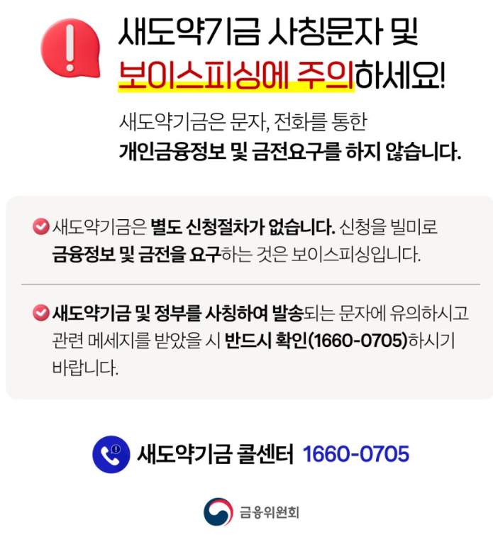 새도약기금은 별도 신청을 요구하지 않으므로 문자나 전화로 금융정보나 금전 요구가 오는 경우 보이스피싱으로 의심해야 한다. 의심스러운 연락은 즉시 콜센터(1660-0705)에 문의하라.