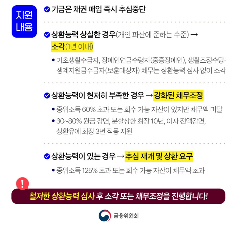 채권 매입 즉시 기존 추심은 중단된다. 상환능력을 사실상 상실한 경우에는 채무 소각을 원칙으로 한다.
