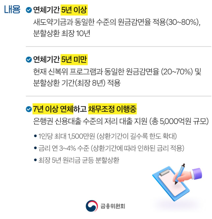 연체기간 5년 미만은 기존 신용회복위원회 프로그램 수준의 감면율과 상환기간을 따른다. 또한 7년 이상 연체 후 채무조정을 이행 중인 사람을 위한 저금리 대출(총 5,000억원 규모, 1인당 최대 1,500만원, 금리 연 3~4%) 지원도 준비되어 있다.
