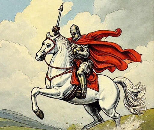 이미지: 하얀 말을 탄 기사, 전진하는 역동성.