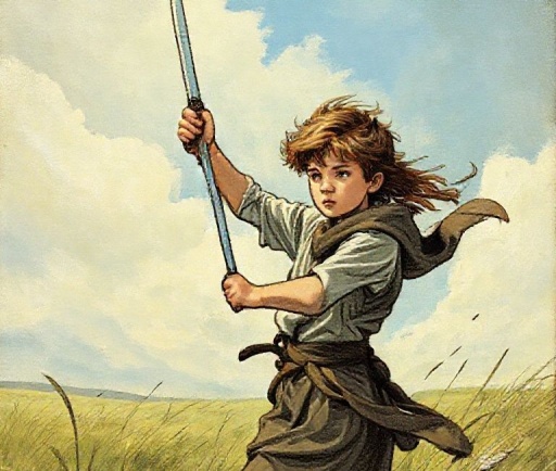 이미지: 바람 부는 들판에 홀로 선 젊은 인물, 검을 높이 든 모습.