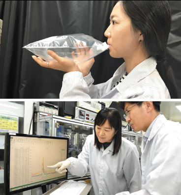 - 가스 성분 포집: 비닐 봉투에 탄소 흡착 튜브 막대를 연결하여, 날숨에 포함된 다양한 가스 성분을 튜브에 포집합니다.