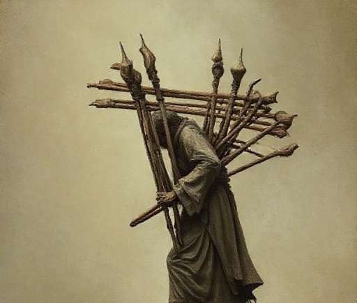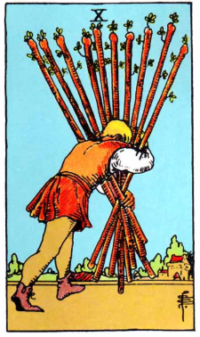 열 개의 지팡이를 들고 무겁게 몸을 구부린 인물. 책임의 무게가 이동을 가로막습니다.