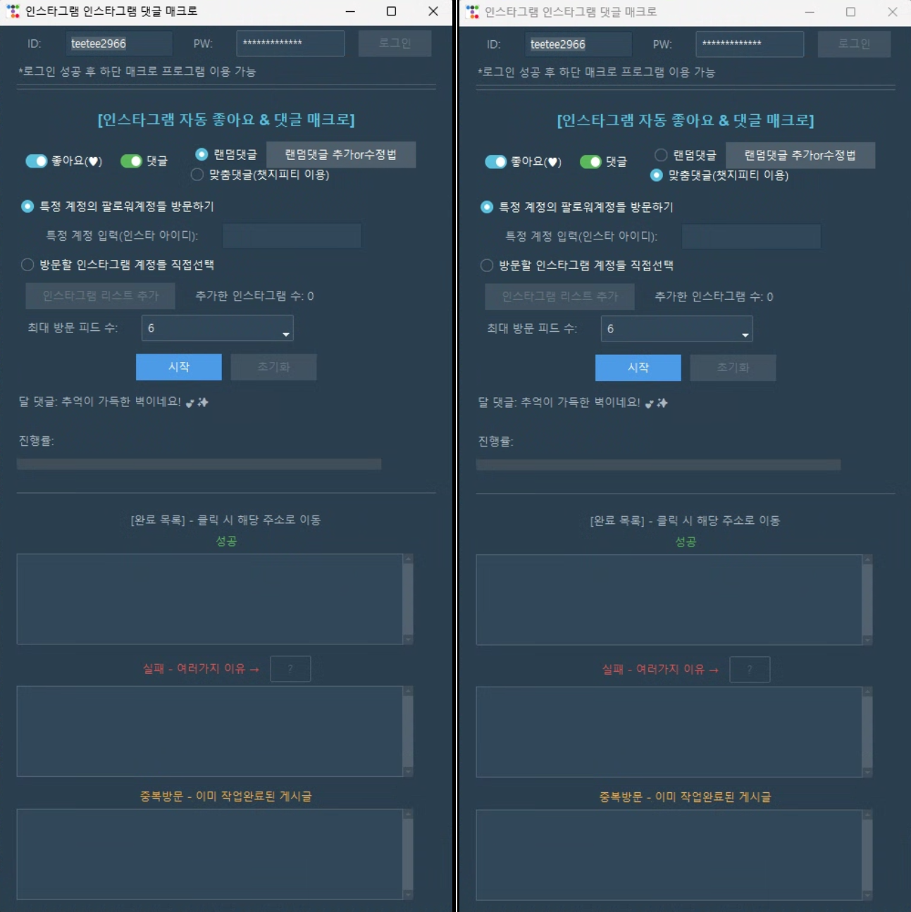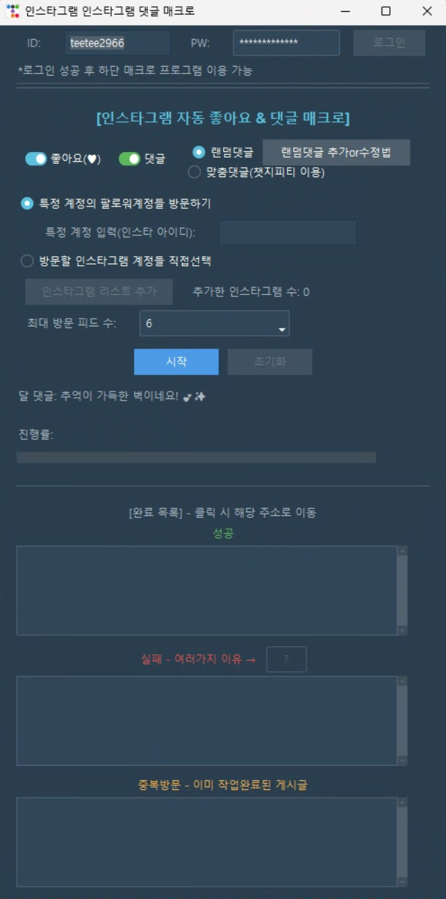 좋아요 작업에 비해 댓글과 팔로워 작업이 더 제한적입니다.
