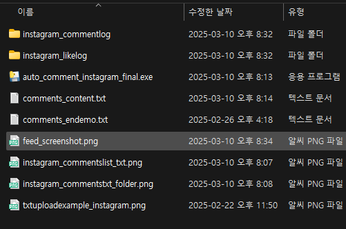 프로그램 구매 시엔 instagram_autobot_program이라는 폴더를 드리며 해당 폴더 안에서 auto_comment_instagram_final.exe파일을 실행시키면 프로그램이 구동됩니다.