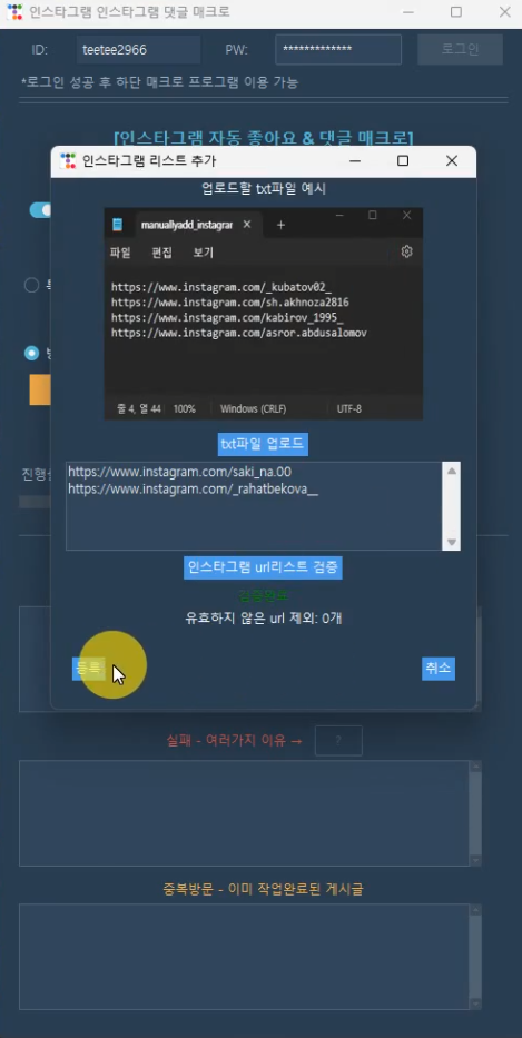 5) <인스타그램 리스트 추가>버튼을 누르고 방문할 인스타그램 링크들이 나열된 .txt파일을 업로드 한 뒤 url검사 받고 <등록>버튼 눌러서 등록함 (100개가 넘어가거나 선택한 최대방문 피드수를 넘어가면 앞에 최대방문 피드수 까지만 가져와짐)
