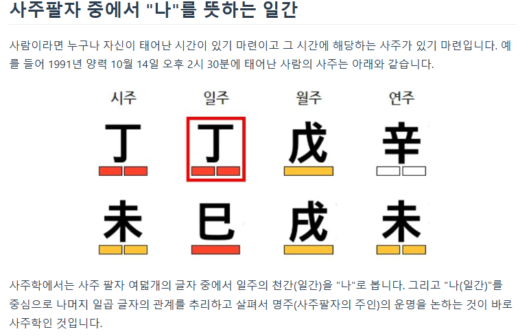 사주를 읽을 때 가장 먼저 확인해야 할 기준는 일간이다.