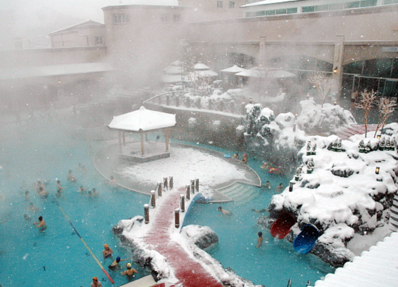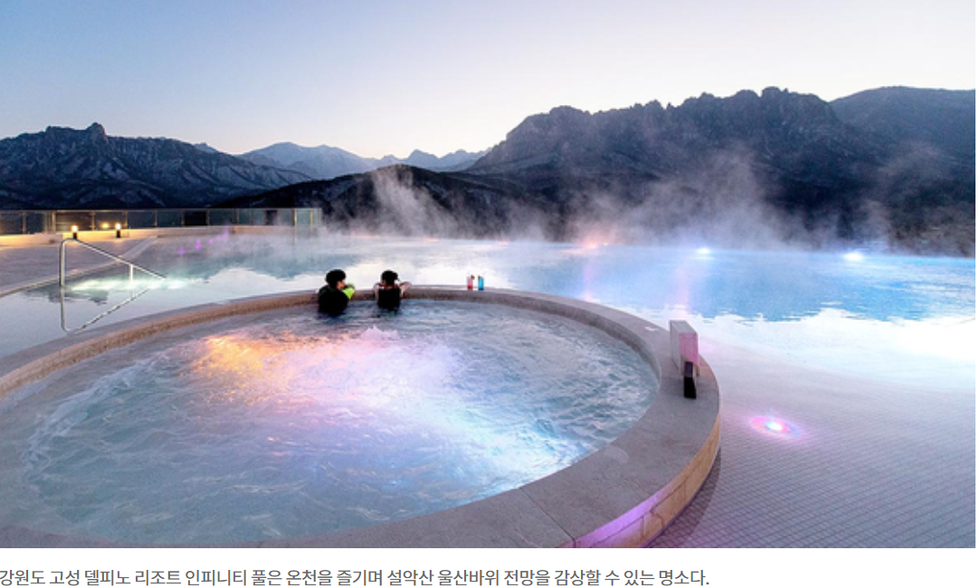 한화리조트 설악의 워터피아 같은 대형 스파 시설을 포함한 리조트형 숙소들이 있어요. 설악의 자연 풍경과 함께 실내외 온천을 즐기기 좋아요. 산 전망을 보며 노천탕에 오래 앉아 있으면, 일본의 산속 료칸 분위기가 납니다.
