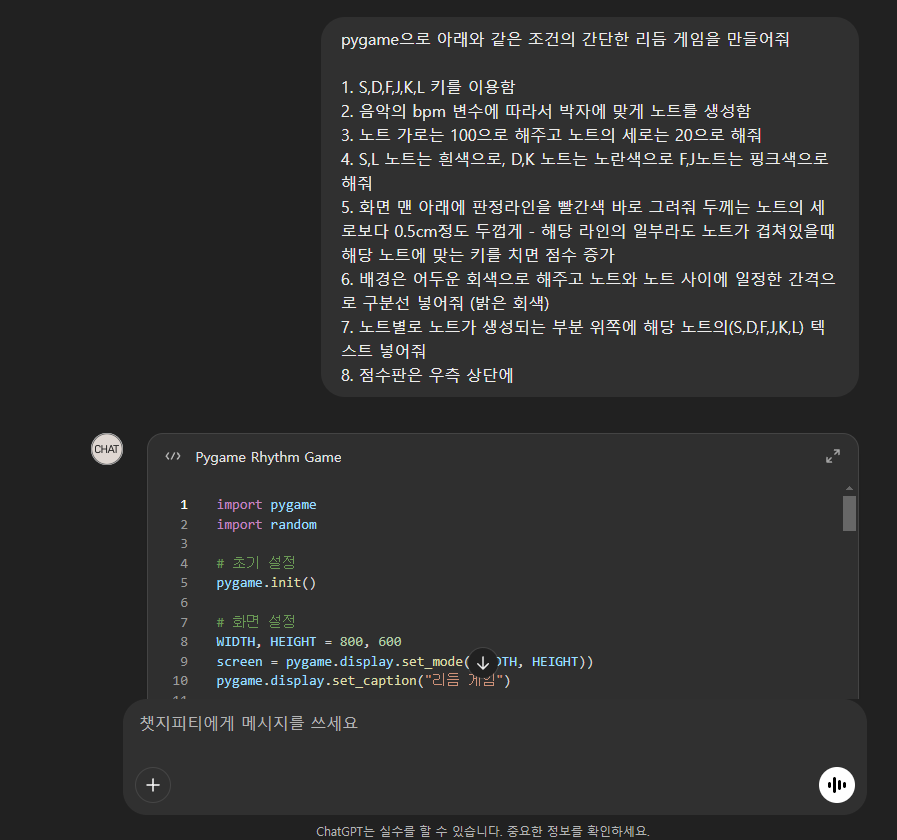 라는 내용의 명령을 주면 코드를 만들어 줍니다. (만들고자 하는 리듬게임을 그냥 두루뭉술하게 "pygame으로 리듬게임 만들어줘" 보다는 비교적 간결한 문장으로 자세한 디테일까지 명시해주면 내가 원하는 대로 게임을 만들어줄 확률이 큽니다)