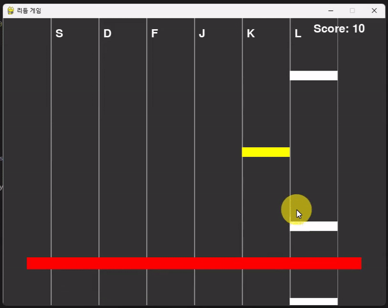 위는 움짤이라 음악이 안나오지만 직접 pygame이 깔린 파이썬 환경에서 실행시켜보면 해당 음원이 나오며, 나오는 음악의 박자에 맞게 노트를 치면 점수가 올라가는 리듬게임이 실행될 것입니다 ^^