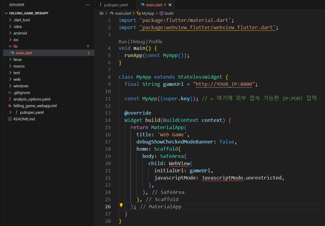 (단 정상동작 하기위해선 해당 main.dart에 넣었던 웹사이트 url 즉, 게임 웹서버가 켜져 있어야함