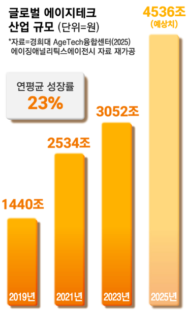 세계적으로 에이지테크 시장이 급성장하고 있으며, 2025년에는 약 4536조 원 규모에 이를 것으로 전망됩니다.