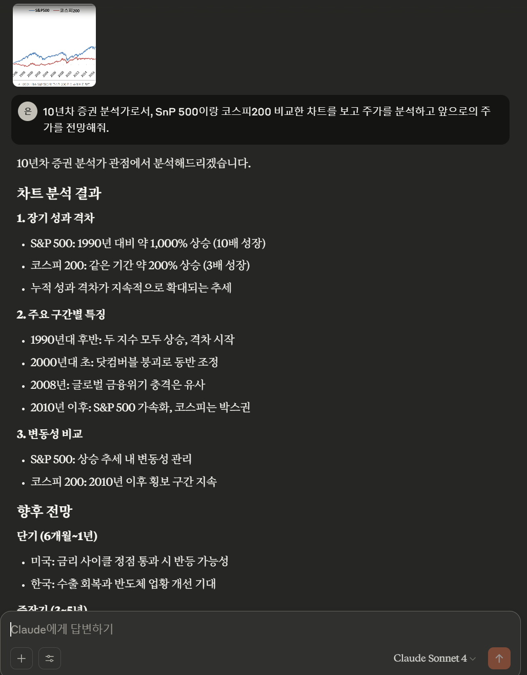 예를 들어 주식 차트 이미지를 업로드하면 클로드는 차트의 추세, 주요 이동평균선 위치, 거래량 변화, 패턴 등을 분석해 객관적인 시각으로 향후 전망까지 제시해 줍니다.