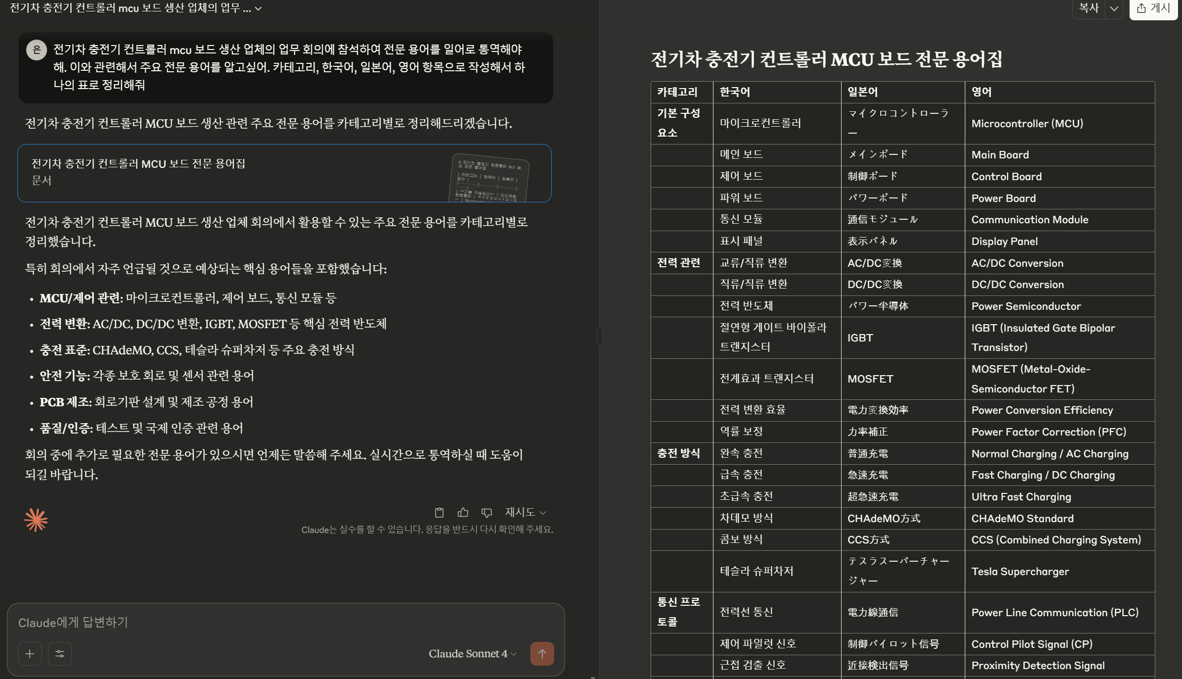 실제 한 통역사가 전기차 충전기 컨트롤러 MCU 보드 생산 회의에 참석하게 되었을 때, 회의 전 클로드에게 전문 용어 정리를 요청해 활용한 사례입니다.