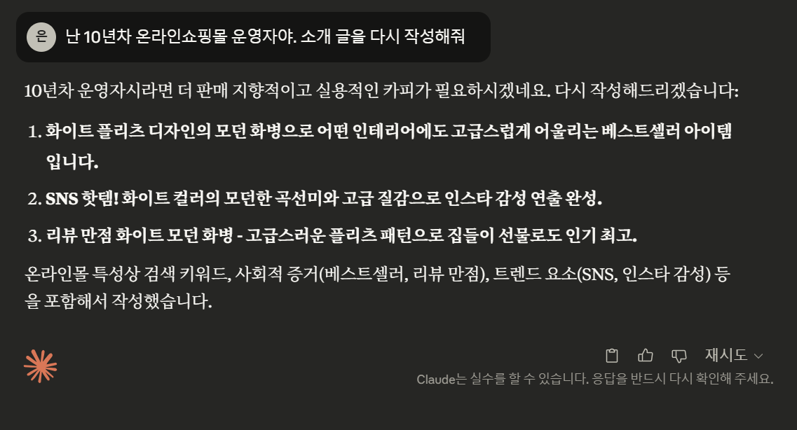 실제 쇼핑몰을 운영하는 입장에서 상품 소개 문구를 클로드에게 요청하면 더 실용적인 결과를 얻을 수 있습니다.