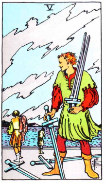 🔹 검 5번 (Five of Swords) — 갈등, 패배감, 그리고 반성