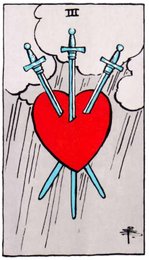 이미지와 상징: 세 개의 검이 박힌 심장. 고통과 눈물을 상징합니다. 구름과 비는 회복의 여지 또한 암시합니다.