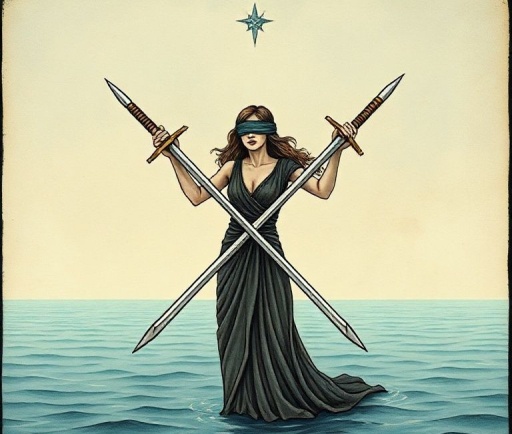 이미지와 상징: 눈가리개를 한 여성이 두 검을 교차시킨 모습입니다. 외부 정보 차단과 균형의 의미가 강합니다.
