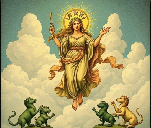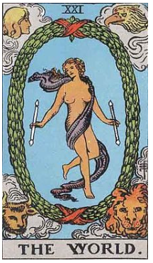 세계 카드의 중심에는 구름 사이에 떠 있는 여성이 있습니다. 그녀는 천에 감싸여 있지만 자유롭게 움직입니다. 손에 쥔 밝은 지휘봉과 머리 위의 화환은 승리와 균형을 의미합니다. 카드 네 모퉁이는 사자, 황소, 사람 얼굴, 독수리로 채워져 있습니다. 이 네 존재는 신약성서의 4복음서를 뜻하기도 하고, 고대 상징으로서 네 원소와 방향, 인간의 통합을 의미하기도 합니다. 융 심리학에서는 이 카드가 자아의 통합과 자기실현을 상징한다고 풀이합니다. 즉, 내면의 여러 부분이 하나로 합쳐지는 순간을 보여줍니다.
