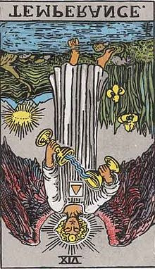 절제 카드는 날개 달린 천사가 한 컵에서 다른 컵으로 액체를 붓는 장면을 보여준다. 이 액체는 의식과 잠재의식, 내적과 외적 세계의 융합을 상징한다. 한 발은 육지에, 다른 발은 물속에 담그고 있어 현실과 감정 사이 균형을 나타낸다. 천사의 후광은 영적 깨달음의 가능성을 암시한다. 천사의 옷에 새겨진 삼각형과 사각형 문양은 물질과 영성, 삼위일체적 조화를 의미한다. 이미지의 모든 요소가 절제의 핵심인 ‘중용’과 ‘융합’을 말한다.