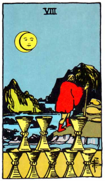 여덟 컵을 등지고 떠나는 인물은 현재의 만족도를 버리고 더 깊은 의미를 찾아 나섭니다. 이별과 전환의 카드입니다.