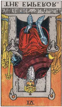 역방향으로 나타나면 권력의 왜곡, 통제의 과잉, 혹은 책임 회피를 의미한다. 상사나 파트너가 지배적으로 변하거나 본인이 지나치게 권력에 집착할 수 있다. 직업적으로는 번아웃 또는 현재 환경이 진로와 맞지 않음을 경고한다. 금전면에서는 통제 부족, 지출 과다 혹은 낮은 보상 구조가 문제일 가능성이 크다. 건강은 무리한 자기관리나 스트레스 누적으로 악화될 우려가 있다.