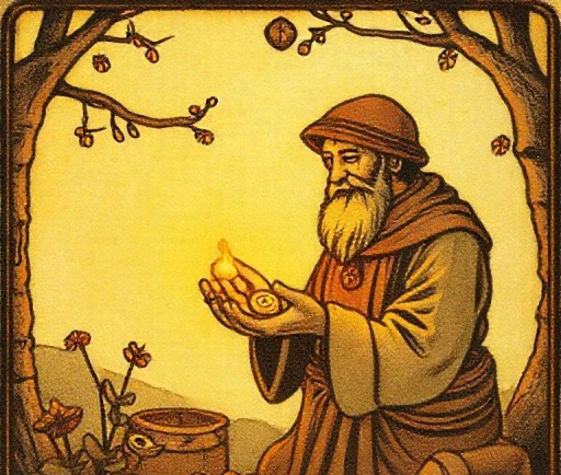 이미지: 동전에 펜타클 문양을 새기는 젊은 장인. 집중과 반복 훈련이 강조됩니다.