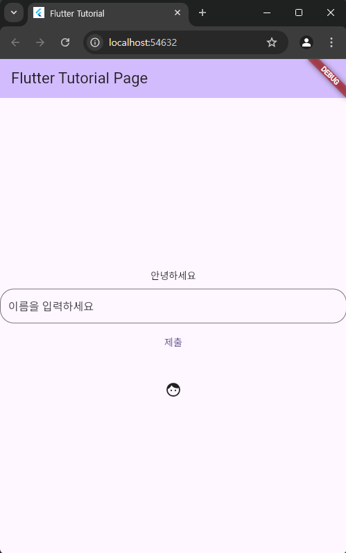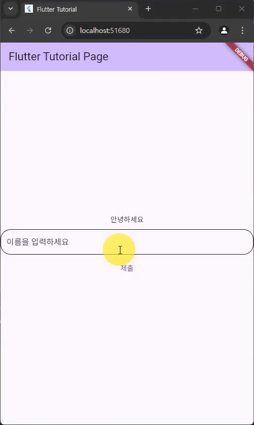 이 Text위젯에 있던 mynamestr가 업데이트 된 모습이 반영되어 화면에 갱신되겠죠. 바로 다음과 같이요.