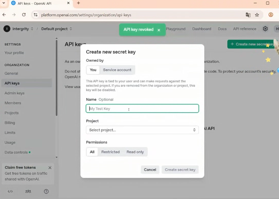 📛 중요: 발급 직후에만 전체 키가 보이므로 꼭 안전한 곳에 저장해두세요! 나중에 다시 확인은 불가능합니다.