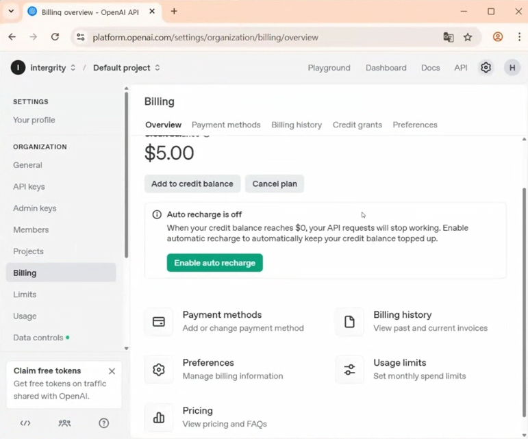 ChatGPT API는 유료 모델이기 때문에 결제 수단을 등록해야 API 키를 정상적으로 사용할 수 있어요.