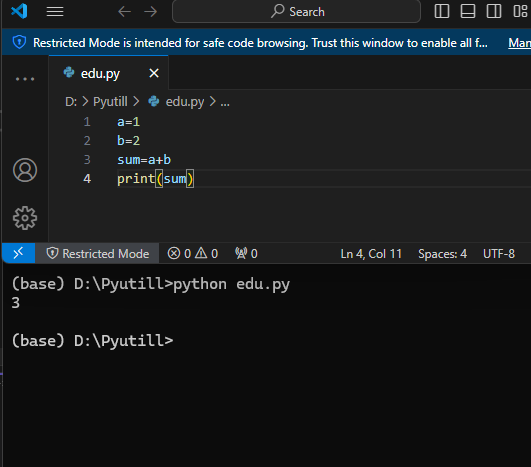 print문으로 sum이라는 변수의 값을 출력할 시 3이 출력되는 것을 알 수 있다.