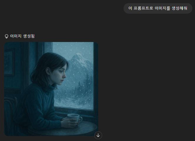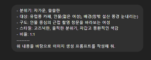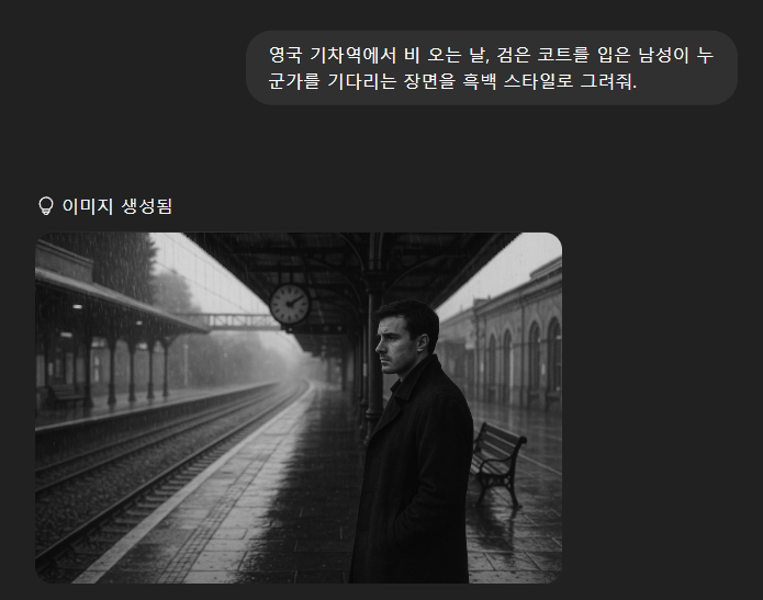 예: “영국 기차역에서 비 오는 날, 검은 코트를 입은 남성이 누군가를 기다리는 장면을 흑백 스타일로 그려줘.”