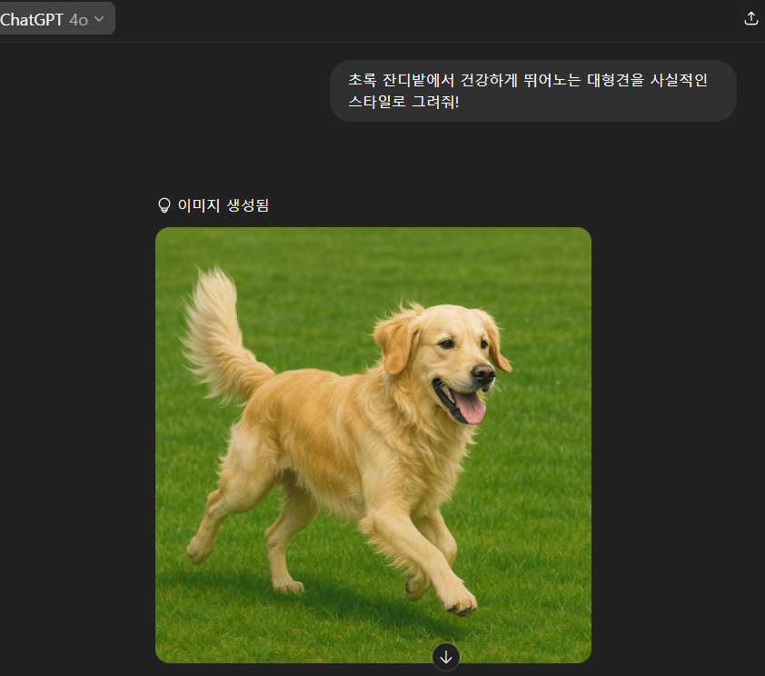 예: “초록 잔디밭에서 건강하게 뛰어노는 대형견을 사실적인 스타일로 그려줘!”
