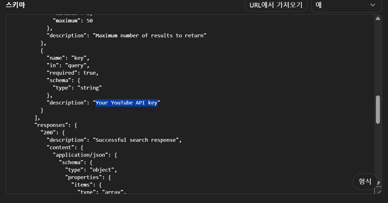 스키마 안에 description 항목에 "Your YouTube API key"부분도 아까 구글 api키 복사한것으로 교체해줍니다.
