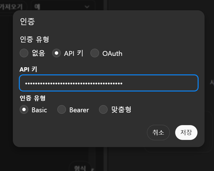 API 키를 입력하고 저장하면 인증이 완료됩니다.