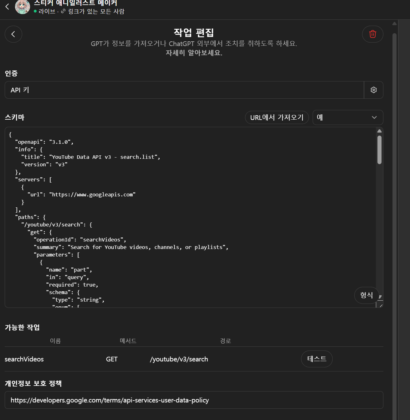 동작 하는 스키마를 내 gpt에 세팅>구성>작업>스키마 창에 넣고 개인정보 처리방침 url도 추가합니다(아래 이미지 참조)