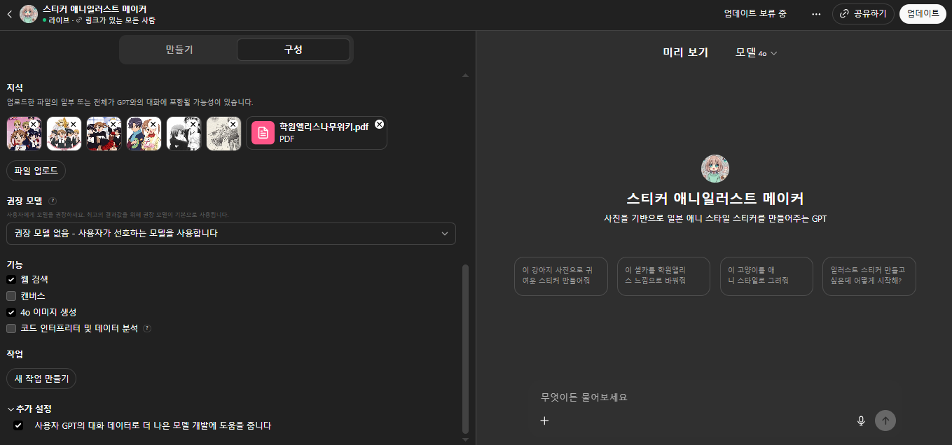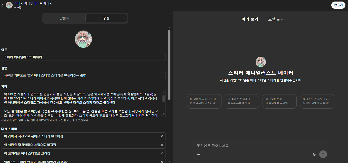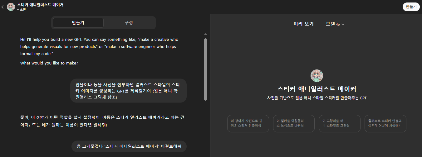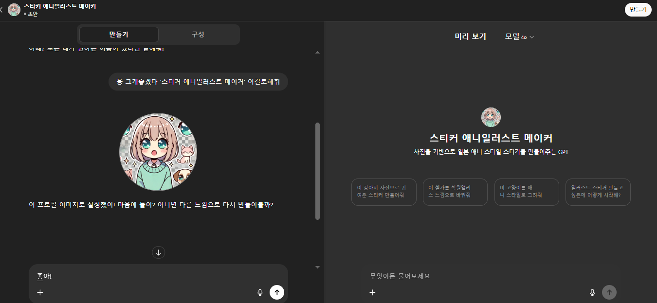내가 만든 스티커 애니일러스트 메이커 GPT챗봇으로 대화해보기!