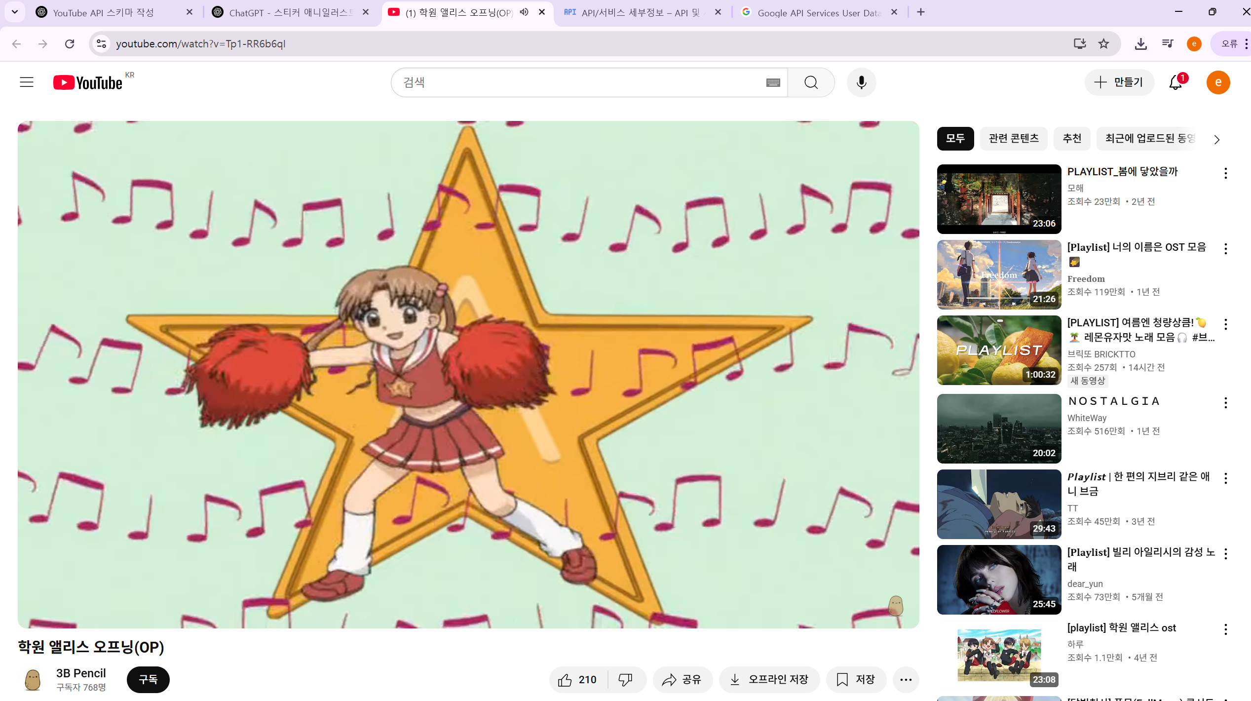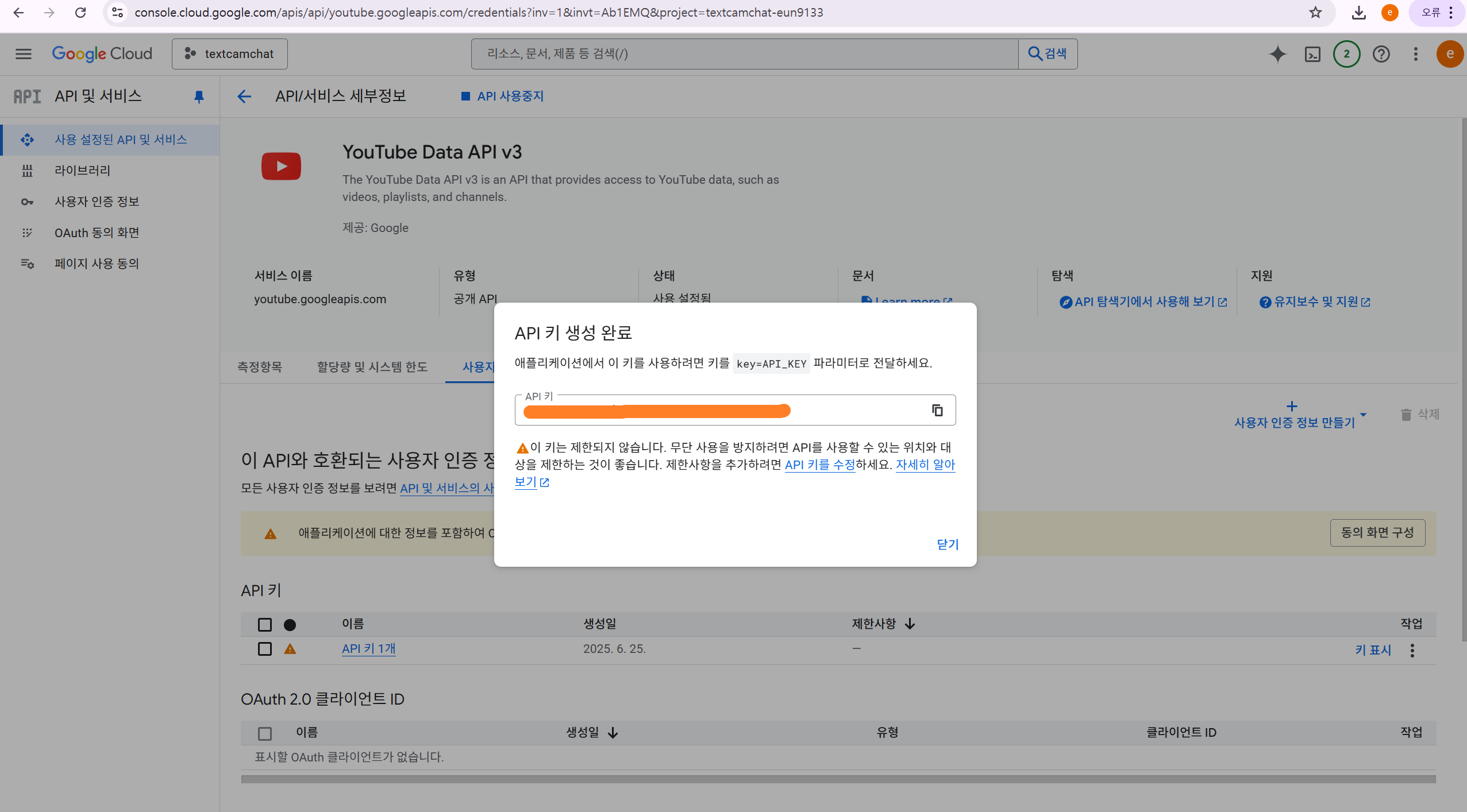 - 구글 클라우드 콘솔에서 YouTube Data API v3를 활성화합니다.