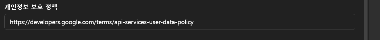 API를 통해 사용자 정보를 다룰 경우, 구글의 개인 정보 보호 정책을 준수해야 합니다. 이를 위해 개인 정보 보호 정책 URL을 입력합니다. 해당 URL은 https://developers.google.com/terms/api-services-user-data-policy 입니다