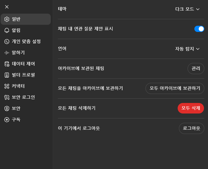 - 데이터 내보내기: 내 대화 기록을 HTML/JSON 형식으로 메일로 받아보기