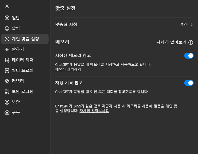 - 맞춤형 지침: "사용자에 대해 알아야 할 정보", "어떻게 응답하길 원하는지"를 설정