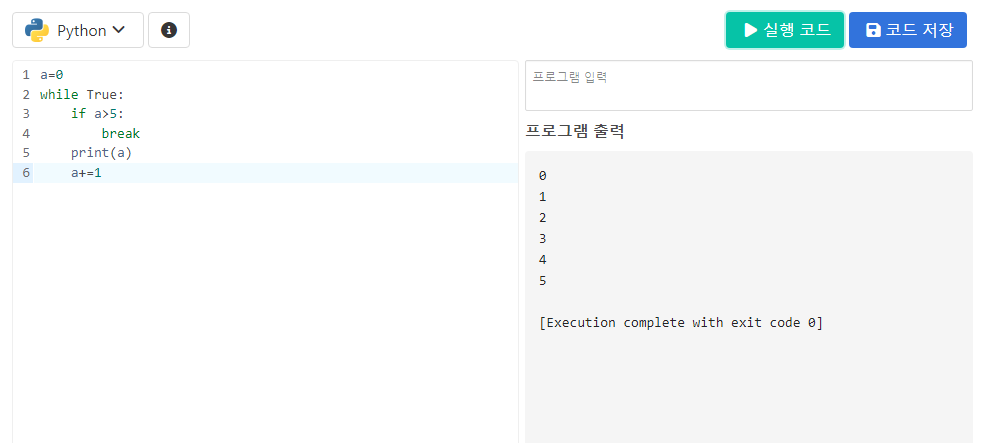 단, 위에 if a>5: break 문으로, a가 5보다 큰 값일때는 break가 실행되어 전체 while문을 빠져나옴으로서,
