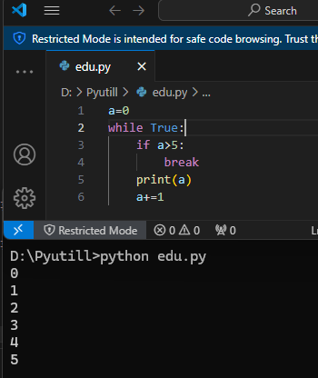 a가 0부터 5일 때 까지만 while문을 탈출하지 않고 그대로 값이 출력되는 것을 알 수 있다.